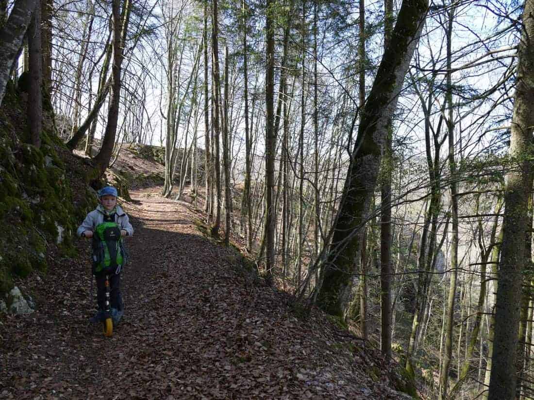 Zwischendurch fand Täve wieder mal ein Überraschungsei im Unterholz. Die Freude war groß, aber stieg bald ins Unermessliche als er kurz darauf einen Feldhasen sah. „Der Osterhase!“ schrie er lauthals. Der kam doch wie bestellt. Nun ging es auf breiteren Forstwegen weiter, der Roller war eine gute Option. Je näher wir der Bronner Höhle kamen, um so enger wurden die Wege. Solche Pfade sagen Täve besonders zu. Hier brauchte er keine Motivation mehr. An der Bronner Höhle angekommen, waren wir begeistert. Eine Riesenhöhle, dass locker ein Einfamilienhaus reinpassen würde. Gigantisch! Hier blieben wir eine Weile und Täve erkundete jede noch so enge Spalte und kletterte alles ab.