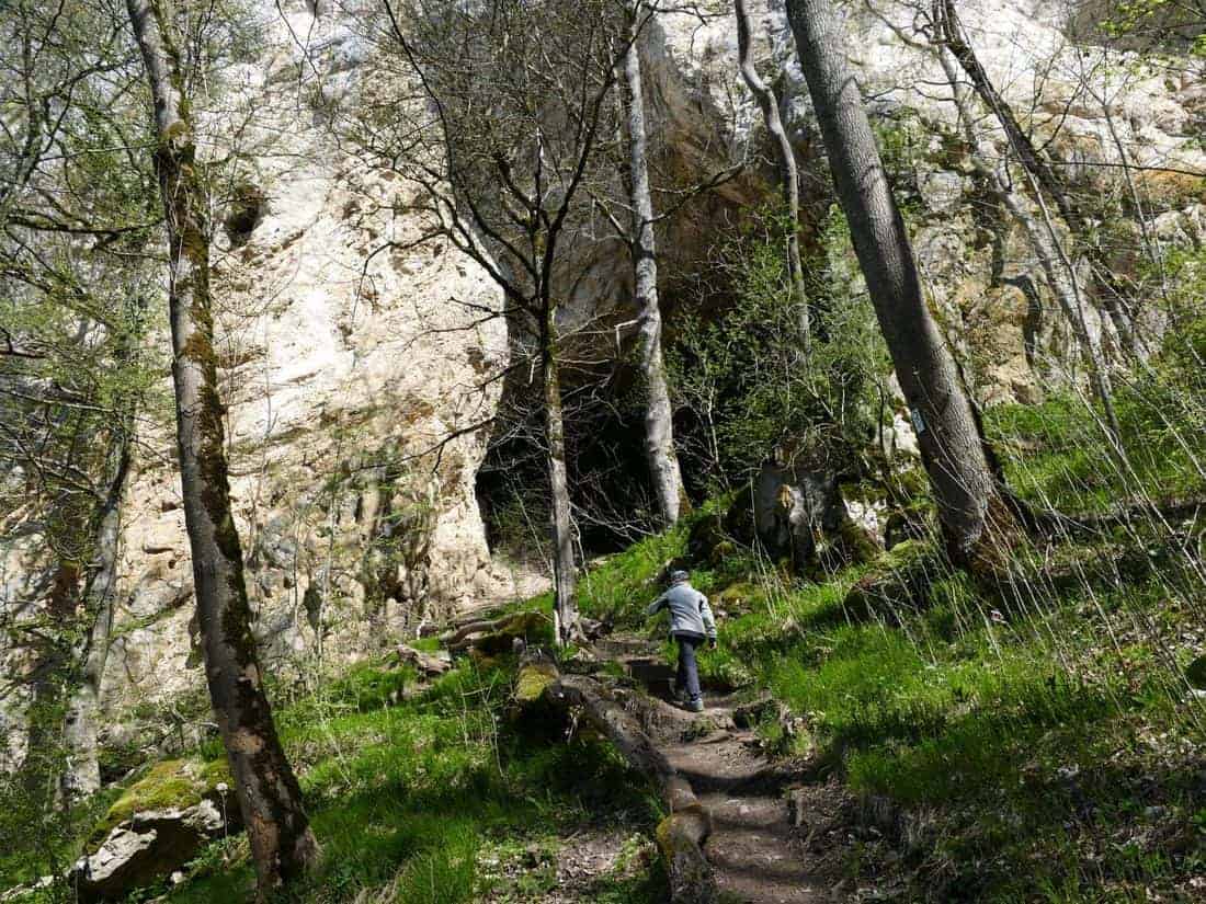 Im weiteren Abstieg zur Donau kamen wir noch an der Jägerhaus Höhle vorbei, die eher ein Felsvorsprung darstellte und direkt am Wanderweg lag. 10 Minuten später waren wir wieder am Donau Ufer, wo es nun wieder ein wenig mehr Trubel gab. Für heute sollte es nur noch am Ufer entlang gehen. Täve rollte des Weges und ich lief hinterher. Unterwegs inspizierten wir die Probst Höhle, die direkt am Wanderweg lag. Ein heruntergekommenes Kneipp Badebecken diente als Pausenplatz. Kurz darauf erreichten wir Beuron und folgten ohne Navi-Check dem Radweg an der Donau. Später sollten wir feststellen, dass wir den Abzweig zur Petershöhle verpasst hatten. So sahen wir die Höhle nun nur von unten. Schade!