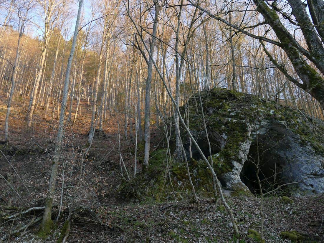 Zwischendurch fand Täve wieder mal ein Überraschungsei im Unterholz. Die Freude war groß, aber stieg bald ins Unermessliche als er kurz darauf einen Feldhasen sah. „Der Osterhase!“ schrie er lauthals. Der kam doch wie bestellt. Nun ging es auf breiteren Forstwegen weiter, der Roller war eine gute Option. Je näher wir der Bronner Höhle kamen, um so enger wurden die Wege. Solche Pfade sagen Täve besonders zu. Hier brauchte er keine Motivation mehr. An der Bronner Höhle angekommen, waren wir begeistert. Eine Riesenhöhle, dass locker ein Einfamilienhaus reinpassen würde. Gigantisch! Hier blieben wir eine Weile und Täve erkundete jede noch so enge Spalte und kletterte alles ab.