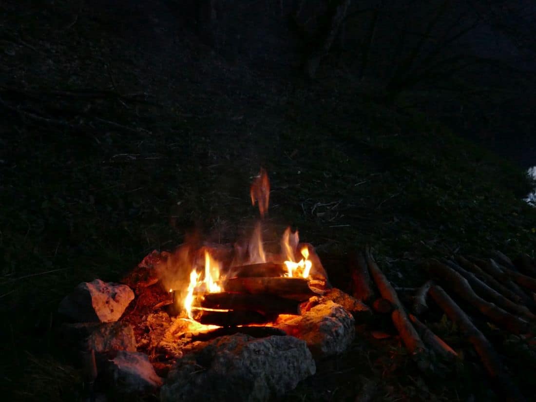 Lange saßen wir heute nicht am Feuer. Die Sonne war kaum untergegangen, Süßes war schnell verputzt und so begaben wir uns bald in die kalte Höhle und schliefen beim Quatschen ein.